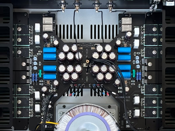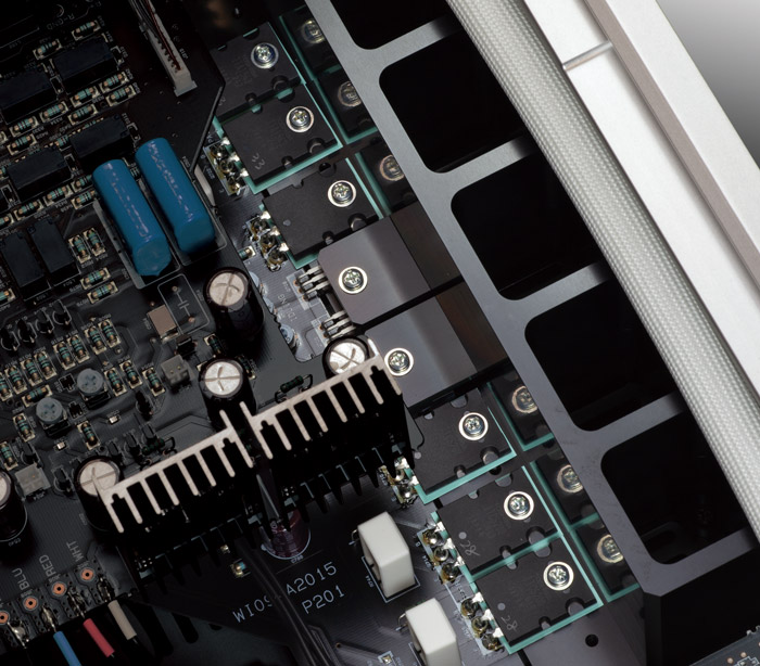 出力ステージとメイン電源で構成されたパワーブロックは、銅箔厚70ミクロンの基板内層プレーンを電源バスバーとして使用し「整流コンデンサ→出力トランジスタ→スピーカー+端子→スピーカー−端子→整流コンデンサ」の大電流ループを最小化。大電流ラインのインダクタンス成分を排除することで、極めて優れた周波数特性と安定性を獲得しました。